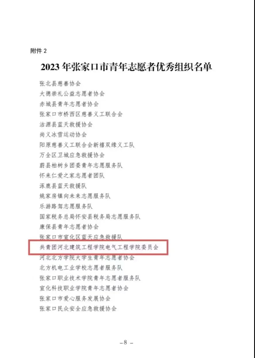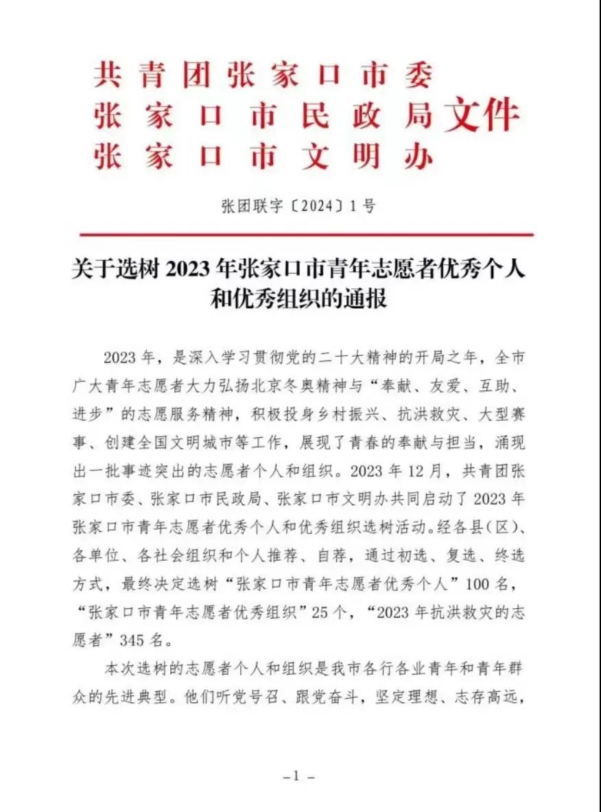 近日,由共青团张家口市委、张家口市民政局、张家口市文明办下发的《关于选树2023年张家口市青年志愿者优秀个人和优秀组织的通报》,suncitygroup太阳成集团团委荣获“张家口市青年志愿者优秀组织”称号。
