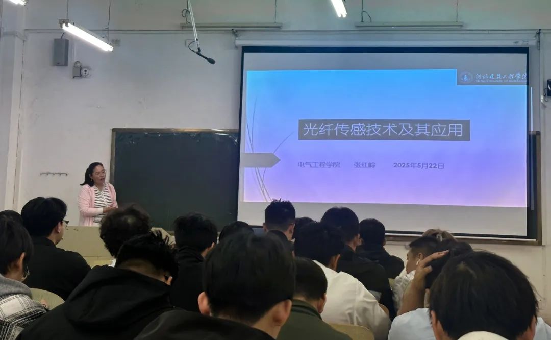 张红岭老师在讲座中系统介绍了光纤传感技术的发展与应用。首先展示了光纤的神奇特性,深入浅出地讲解了光纤的传输原理和结构特点。随后解析了光纤传感系统的组成,包括光源、光纤、调制器(传感器、探头或敏感单元)和探测器等核心部件,并介绍了按干涉型、强度调制型等不同原理的传感器分类。在应用方面,张老师列举了光纤传感技术在工业监测、环境监测、医疗诊断等领域的广泛应用案例。讲座过程中,张老师还与现场学生进行了互动交流。同学们积极提问,张老师耐心解答,现场气氛活跃。整场讲座内容丰富,既有理论深度又贴近实际应用,为同学们提供了宝贵的学习机会。