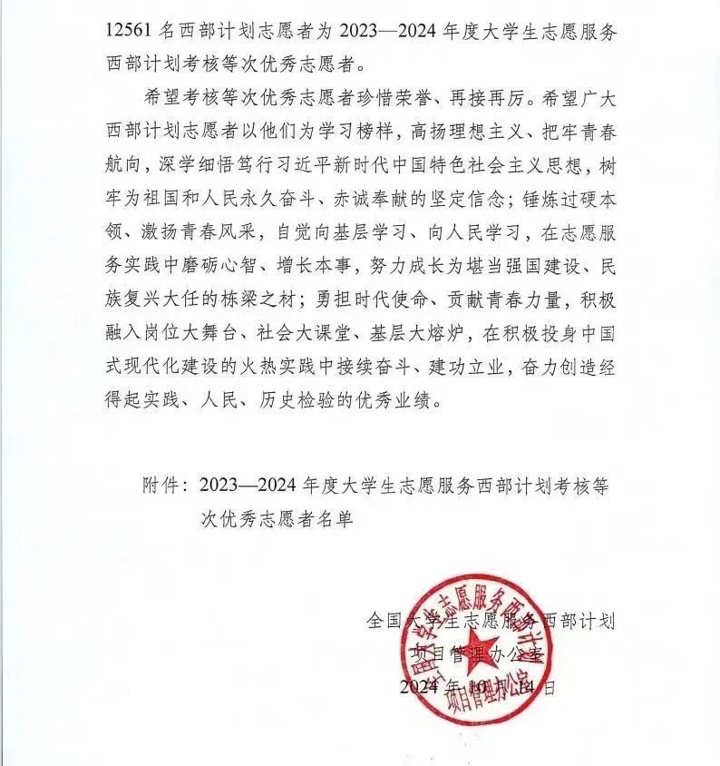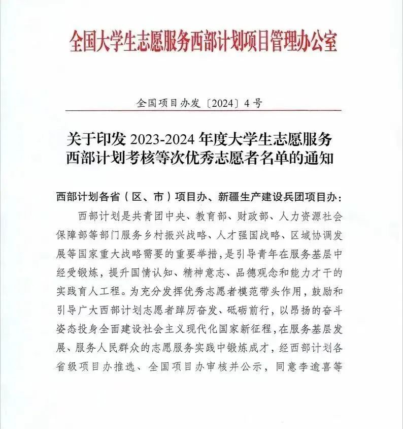 在全国大学生志愿服务西部计划项目管理办公室印发的《关于印发2023-2024年度大学生志愿服务西部计划考核等次优秀志愿者名单的通知》中,太阳成电子193班毕业生杨朝江获评全国2023-2024年度大学生志愿服务西部计划优秀志愿者。