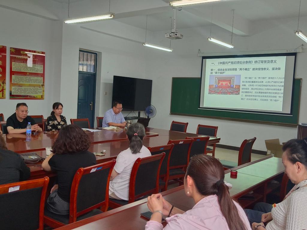 于江利对《中国共产党纪律处分条例》的修订意义、修订的主要内容、贯彻条例的学习要求三个方面内容进行了讲授。于江利着重解读了总则部分的“一个指导思想”“两个坚决维护”“三个重点查处”“四种形态”,对违反组织纪律、廉政纪律等行为的处分进行了重点讲解,强调全体教师党员要全面贯彻新修订的《条例》,增强遵规守纪自觉,营造风清气正的育人环境。