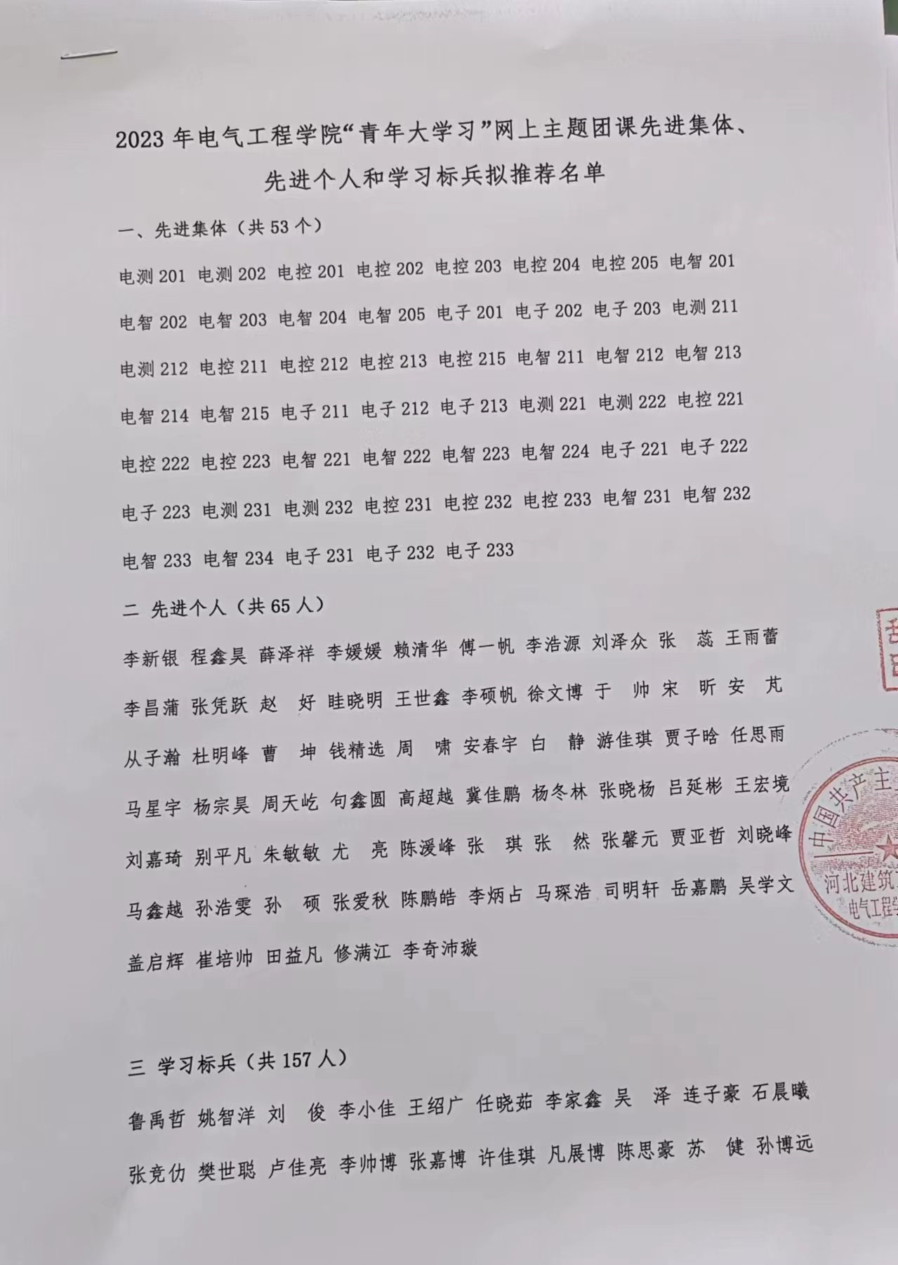 根据共青团河北建工学院委员会《关于表彰2023年“青年大学习”网上主题团课十佳(先进)单位、先进集体、先进个人和学习标兵的通知》文件要求结合太阳成实际情况,本着公平公正公开的原则,suncitygroup太阳成集团对2023年“青年大学习”网上主题团课先进集体、先进个人和学习标兵进行了评定工作。