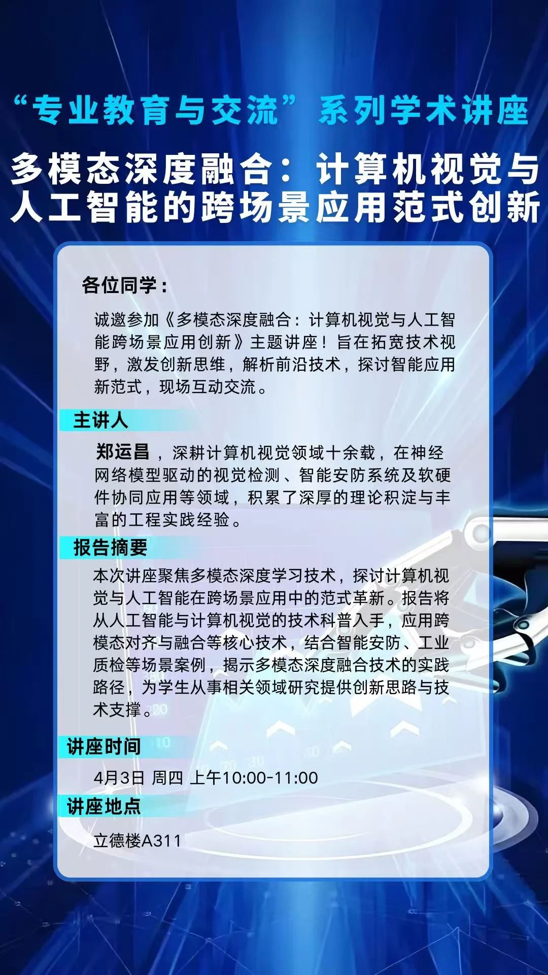 suncitygroup太阳成集团“专业教育与交流”系列学术讲座第四讲预告: 《多模态深度融合:计算机视觉与人工智能的跨场景应用范式创新》