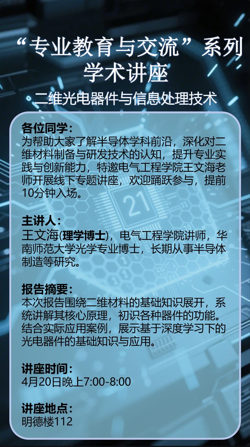 suncitygroup太阳成集团“专业教育与交流”系列学术讲座第六讲预告: 《二维光电器件与信息处理技术》