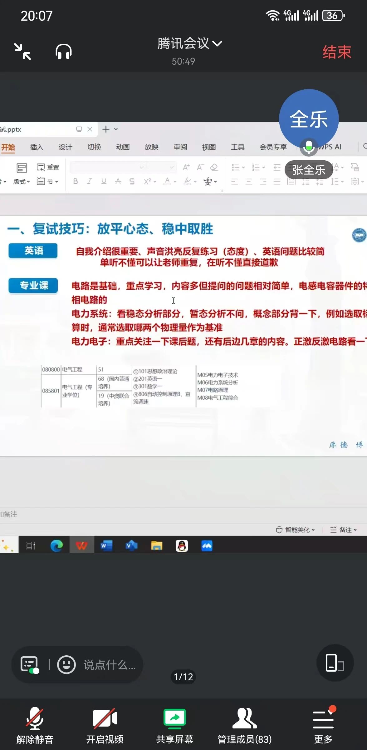 随后,他们分享了专业课学习的重点,特别是电路基础和电力系统的稳态分析部分,介绍了电力电子课程的重点关注章节和课后题目的重要性。